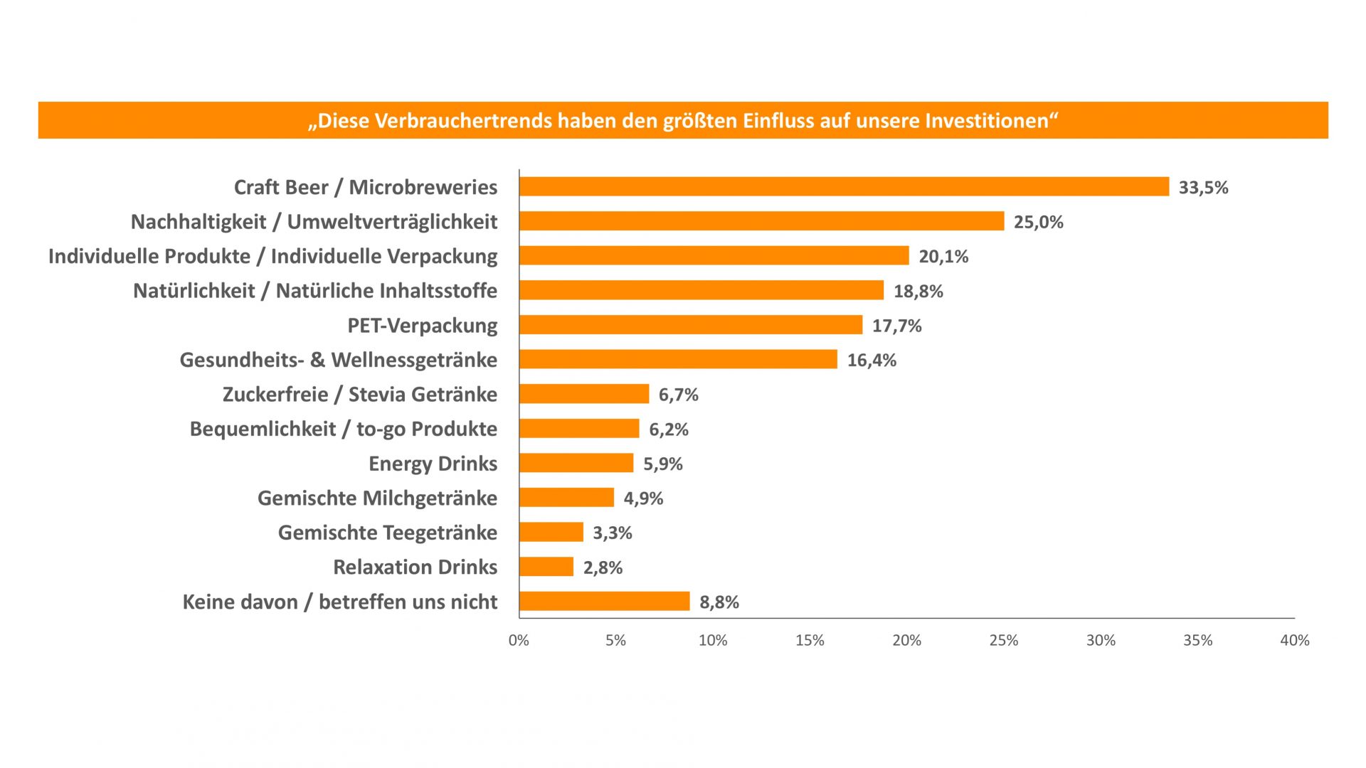 Die Umfrage zeigt außerdem, welche Verbraucher- und Fertigungstrends die Investitionen am stärksten vorantreiben. So haben für rund jeden dritten der Trend zu Craft Beer und Microbreweries (33,5 Prozent) einen großen Einfluss auf die Investitionen, Nachhaltigkeits- und Umweltaspekte (25 Prozent) spielen ebenfalls eine wichtige Rolle. Auch bei der Individualisierung (20,1 Prozent) und dem Wunsch nach natürlichen Inhaltsstoffen (18,8 Prozent) handelt es sich um wichtige Verbrauchertrends. Im Fertigungsbereich haben sowohl die Automatisierung der Produktion (31,3 Prozent) als auch Energieeffizienz und Energierückgewinnung (23,5 Prozent) einen großen Einfluss auf die Investitionsentscheidungen.