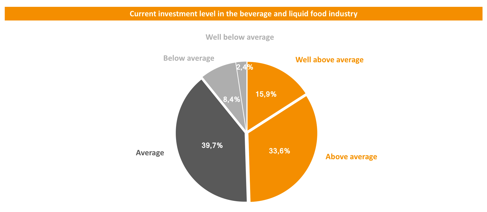 The beverage and liquid food industry can expect to see good market growth in the next year: In comparison with the previous trade fair, 45 percent of visitors plan to keep investments at a similar level. On the other hand, nearly half of respondents (48.8 percent) intend to increase investments by an average of 23.7 percent. And they plan to do so even though their companies are already making very high investments: Compared with previous years, 49.5 percent of respondents are already making above-average investments. In addition, 15.9 percent are even making significantly higher ones, while only 10.8 percent are making below average investments.