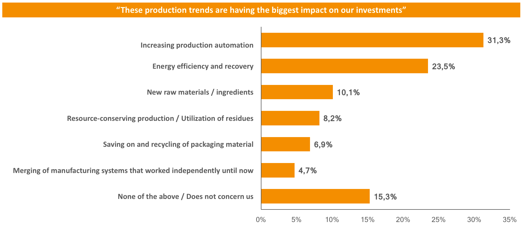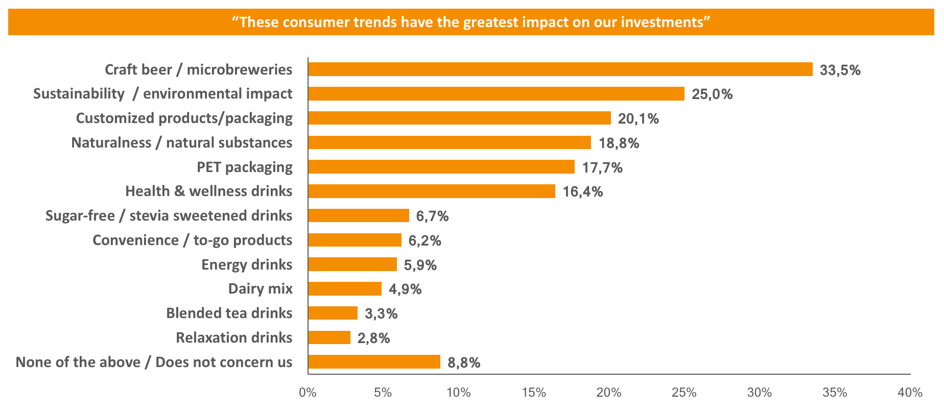 The survey also identified the consumer and production trends that investors are paying attention to most. Roughly one third (33.5 percent) said the trend toward craft beer and microbreweries was having the greatest impact on investments. Sustainability and environmental issues also play a major role (25 percent), while important consumer trends included individualization (20.1 percent) and the desire for natural ingredients (18.8 percent). In production, both automation (31.3 percent) and energy efficiency and recovery (23.5 percent) have a major sway on investors.
