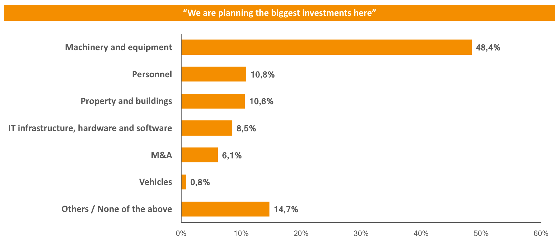 The respondents said they plan to make most of their investments in machinery and equipment (48.4 percent), personnel (10.8 percent) and properties and buildings (10.6 percent). Companies are planning to make additional investments in other areas as well, such as 33.2 percent intending to increase investments in marketing, and one third of respondents planning to invest more in research & development (32.6 percent) and sales (31.9 percent).