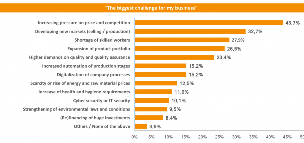 The survey also asked about the biggest challenges facing the respondents’ business. Nearly half (43.7 percent) cited intensifying pressure on prices and competition, followed by the tapping of new markets (32.7 percent) and the shortage of skilled employees (27.9 percent). Expansion of the product portfolio, quality assurance and increased automation of production steps were also cited as fundamental issues.